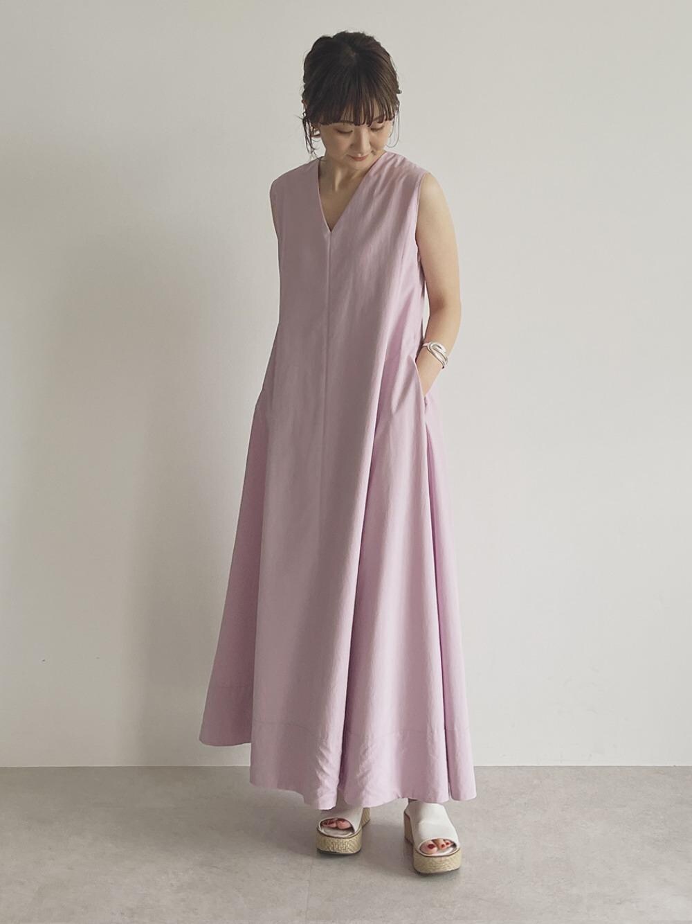 【身長160㎝、ワンピース(size:M)、(シューズ スタッフ私物)】 一枚でキマる、この夏オススメのワンピース。 ポケットありが嬉しいポイントです。
