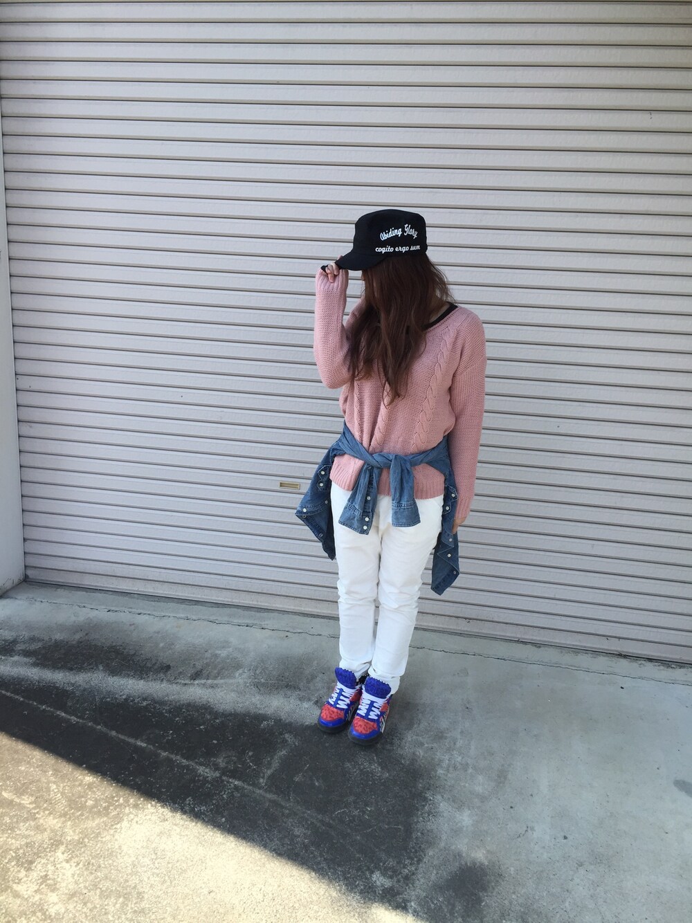 春を意識してピンクのニットと白パンツを合わせてみました。甘くなりすぎないようにスニーカーとキャップでボーイッシュさをプラス。