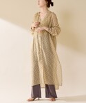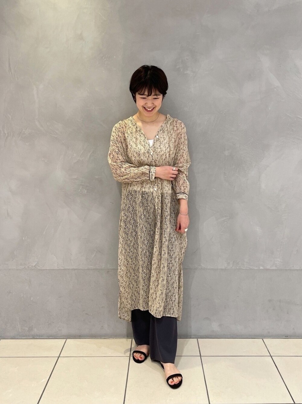 透け感のある柄のシャツワンピース にニットパンツを合わせて華やか かつ楽ちんスタイルに! さらっとした素材とニットとの 組み合わせで春夏どちらとも 活躍するアイテムです◎