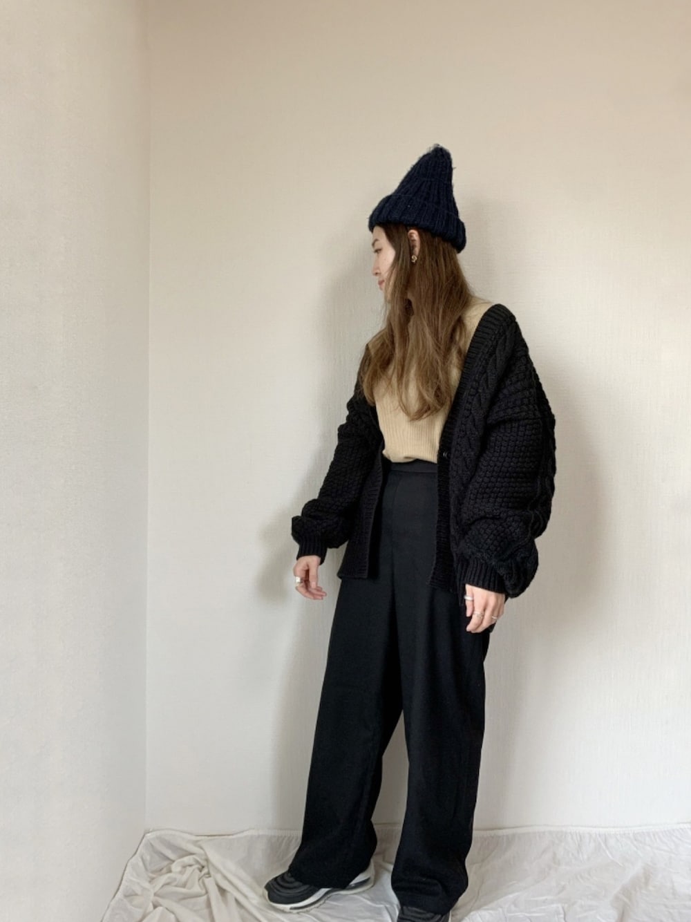 miki8_097のカーディガン/ボレロ「洗えるミドル丈ケーブルビッグカーディガン」を使ったコーディネート
