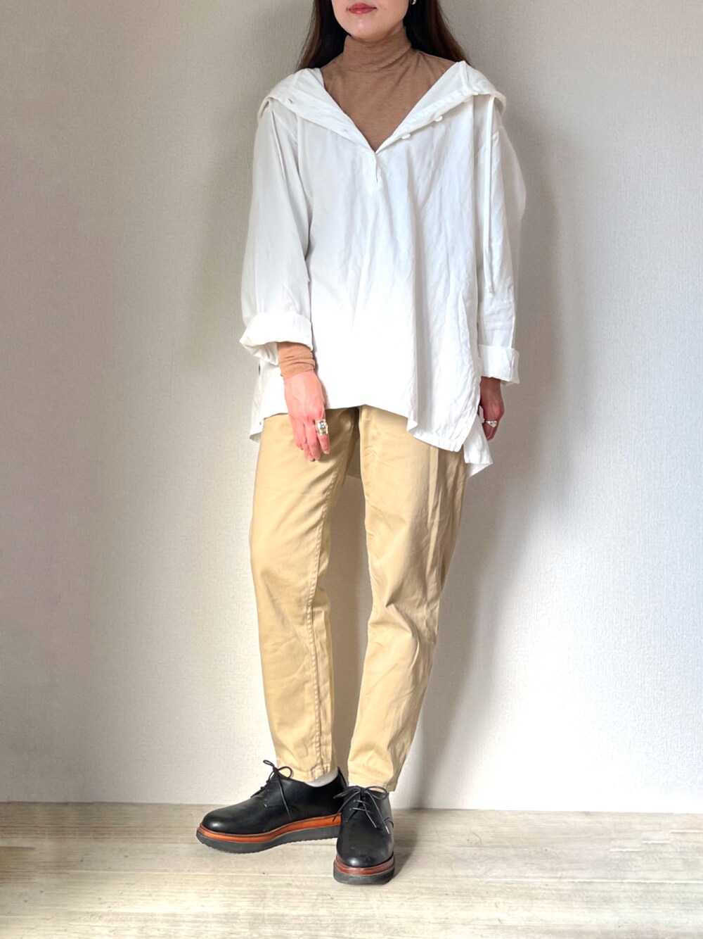 白×ベージュの組み合わせ好き💕 ハイネックをインナーにしてカジュアルすぎずシックさもあって⭕️