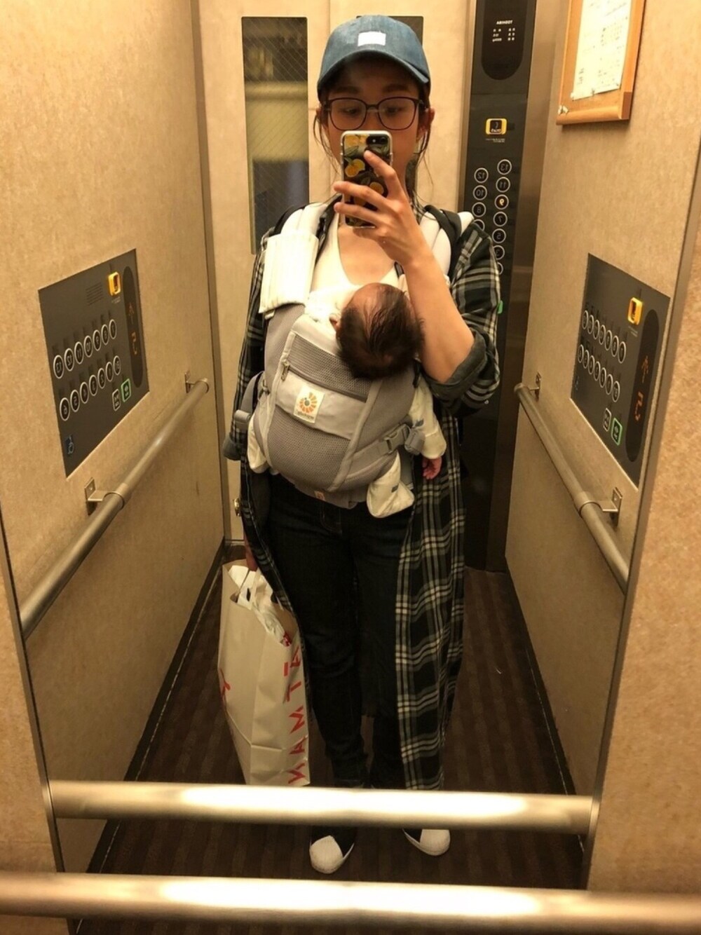 ロングシャツで暑さ調整。 隠しきれない腕の筋。 息子さんぐっすり熟睡中。