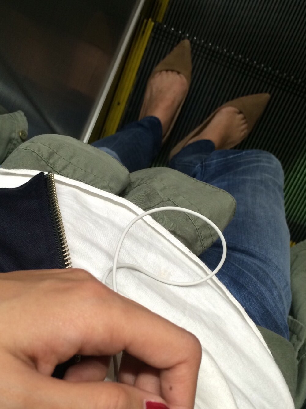 リバーシブルのMA-1風アウターと、ローヒールのパンプスで強めな雰囲気。