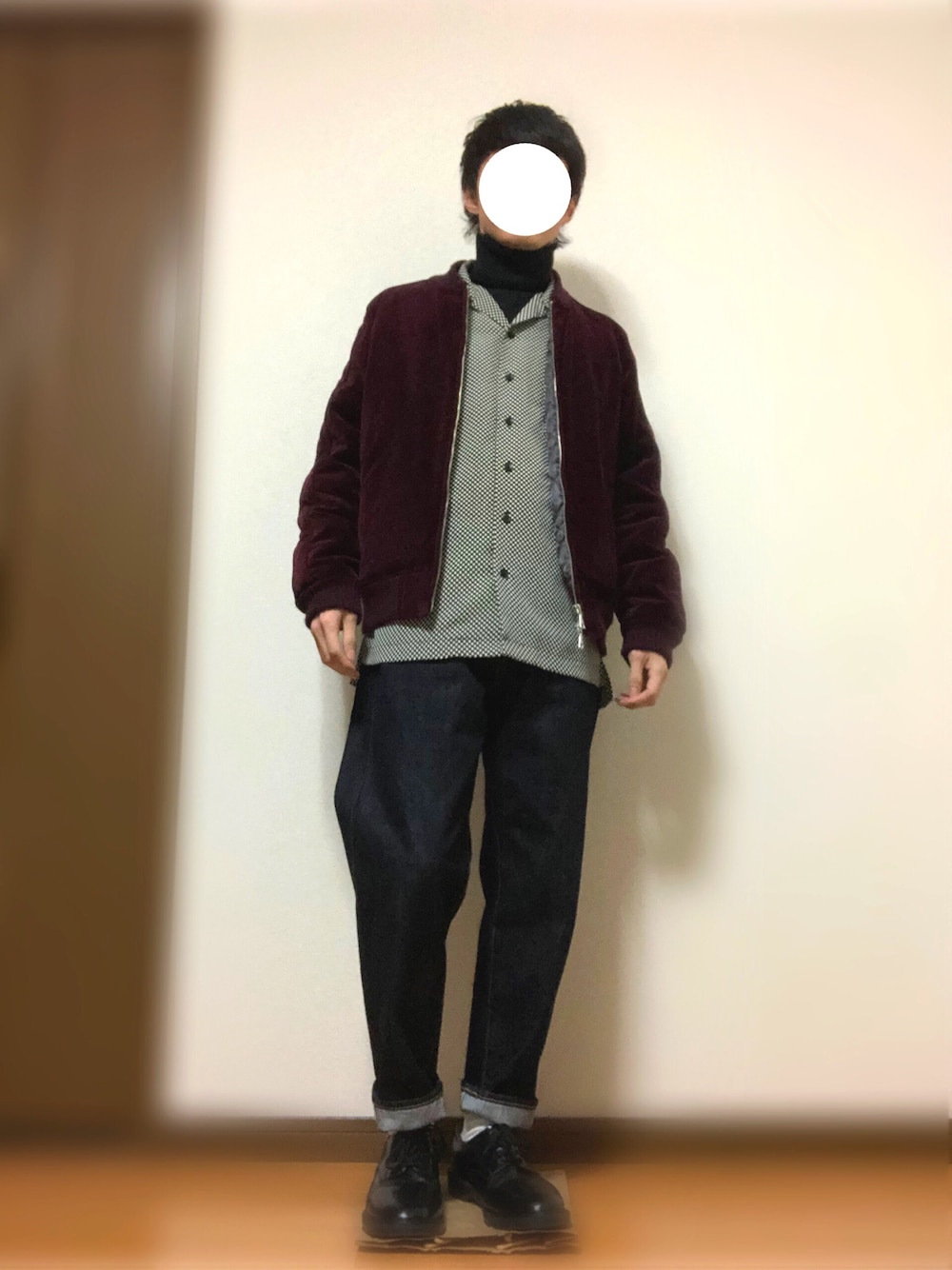 ボルドーのスカジャンにインナーは市松柄のシャツ合わせました。首元は黒のハイネックいれてレイヤードしてます。デニムは買ったばかりなのでこれからどんどん履き込んでいい味出していきたいですねー。楽しみです。
