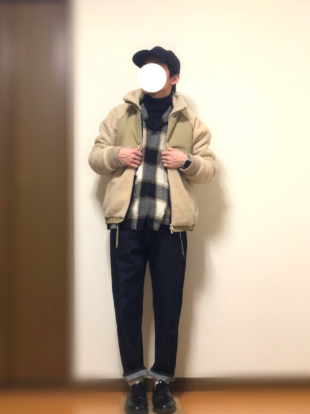 このボアジャケットお気に入りです。 インナーは開襟のシャツジャケット。タートルネックと合わせました。hatskiのデニムですがテーパート加減がたまらないです。他の型も買おうか迷ってます。。。