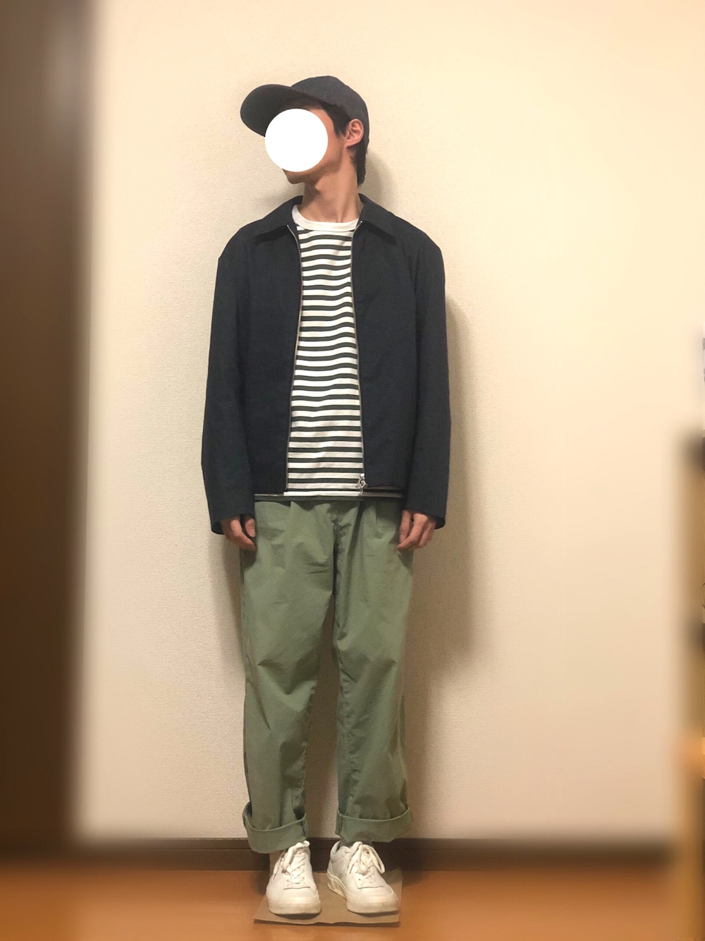 ブルゾンの素材がリネンなのでサラッと着れますし、デザインもシンプルで色々と合わせやすいです。配色はグリーンをベースにキャップとブルゾンでネイビー入れてみました。足元はお気に入りのヒールスター