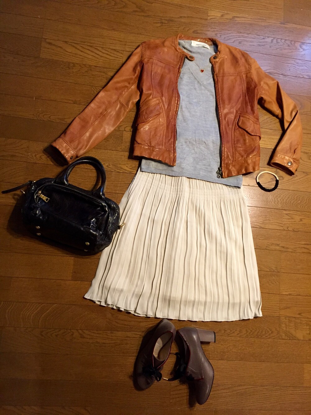 上品なプリーツスカートできれいめカジュアル。