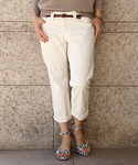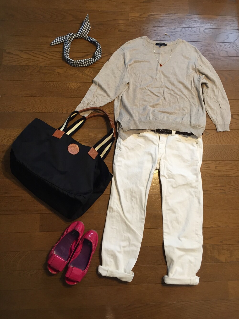 涼しげな麻100%ニット。 足元はビビッドピンクでアクセント。