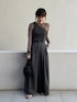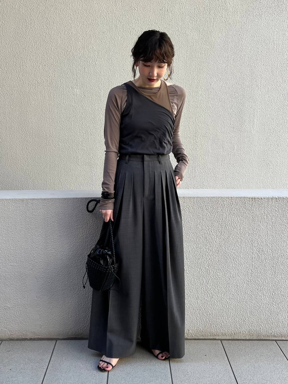 【スタイリングポイント】 グレー×ブラウン合わせでクールな印象に。トップスがややコンパクトなので、ワイドパンツで綺麗めに。アクセサリーはゴールドで女性らしさをプラスしました!