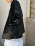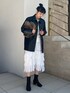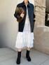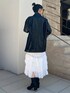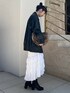 【サイズ感】 〈アウター〉 ゆったり。ステンカラー型のシングルカバーオール。よりリアルに近い技術で表現されたヴィンテージレザー。着丈は長めでスッキリとした身頃がポイントです。 〈スカート〉 ゆったり。ウエストゴムの楽ちんな着心地。前後差のある着丈なのでブーツ合わせや、パンツとのレイヤードもおすすめ◯ 【素材感】 〈アウター〉 レザー加工の歴史が長いレザーテックス社のヴィンテージフェイクレザーを使用。 〈スカート〉 綿100% インド製の細かいメッシュ状のコットンベース生地。サラッとした涼しい生地。フリルの重みがあるため、畳みで収納がオススメです◯