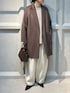 【サイズ感】 〈アウター〉 ゆったり。シンプルなシングル仕立てのリバーコート。ドロップショルダーで袖幅もゆとりがあるデザイン。身長関係なく、バランスの取りやすいミディアム丈。 〈パンツ〉 ゆったり。ウエストゴムの楽ちんパンツ。ウエストは絞れるよう中にドローコード付き。たっぷりボリュームで大人のリラックスシルエット。 【素材感】 〈アウター〉 羊毛88% カシミヤ9% ポリエステル3% ピュアウールとカシミヤのみを使用した、ハイクオリティなコート。とにかく軽く、ウールの暖かさと、滑らかな着心地が特徴。 〈パンツ〉 しっかりとした張り感と厚みがありながら、軽くて動きやすい生地。伸縮性のあるポリエステル混合でストレッチも効いた楽ちんパンツ。お家で洗濯可能◎