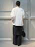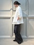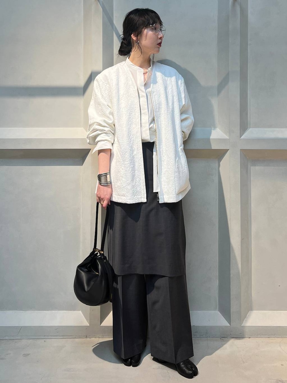 【サイズ感】 〈アウター〉 ゆったり。ミリタリーのライナーコートのような軽いブルゾン。裾にタブがあるのでシルエットを調節できる仕様に。着丈はちょうどヒップライン下の安心丈。 〈ボトムス〉 ややゆったり。6cmヒールで着用。やや腰で落として着丈を出しています。太すぎないワイドシルエット。センタープレス入りできれい見え。ウエストゴムの楽ちんパンツです。 【素材感】 〈アウター〉 ポリエステルと綿の混紡素材。フランスの老舗ジャカードメーカー、dutel社のふくれジャカードを採用。コットンシルクのような見た目。キルティング状で軽さが魅力。 〈ボトムス〉 ウールとポリエステルの混紡素材。シワになりにくく、最高級のメリノウールを使用。ストレッチの効いたストレスフリーなパンツです。お家で洗えるのも嬉しいポイント☑︎