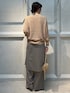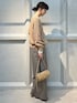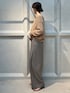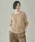 【サイズ感】 〈トップス〉 ゆったり。首周りは鎖骨が見えないぐらい。身幅とアーム部分にゆとりがあり、全体的にリラックス感のあるシルエット。 〈パンツ〉 ややゆったり。太すぎないワイドシルエット。センタープレス入りできれい見え。ウエストゴムの楽ちんパンツです。 【素材感】 〈トップス〉 ポリエステルと綿。ふっくらと空気を含んだ独特なタッチが特徴。ローゲージで透けも激しくなく、チクチクしにくい着心地。お家で洗濯もできます。 〈パンツ〉 ウールとポリエステルの混紡素材。シワになりにくく、最高級のメリノウールを使用。ストレッチの効いたストレスフリーなパンツです。