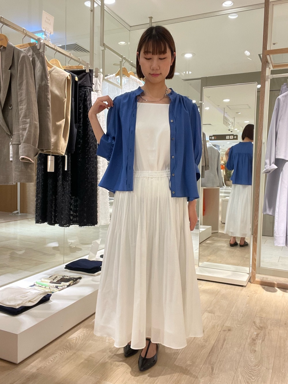 店頭でも人気の 5分袖ギャザーブラウスを 羽織りとして、着てみました✨ もちろん、前を閉めてトップスとしても 着られます!! 鮮やかな青色が夏らしく、 コーデのポイントになります✨ ショート丈でバランス良く着られますし、 軽くて柔らかい生地感が着心地抜群です!! ボトムスは新作のスカートを 合わせてみました!! ウエストはゴムで、調節も可能です! ハリのある生地感なので、 形状維持の効果があり、 ふわっと可愛いシルエットが出ます!! 丈のサイズ展開になっていて、 155cm(低身長)の私は、 短い丈のサイズで くるぶしくらいの丈感です!!