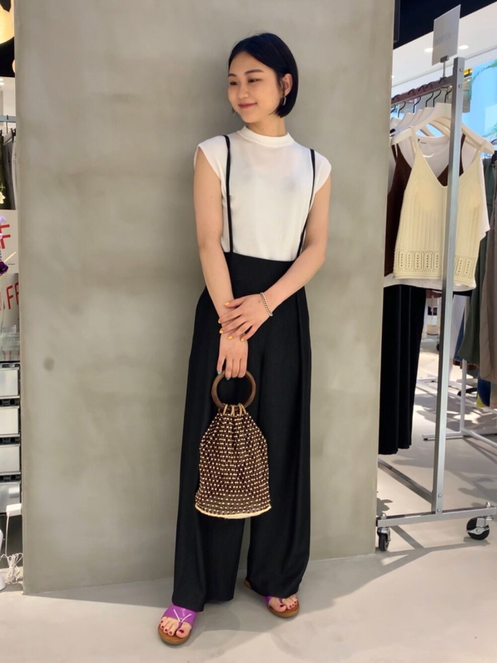 サス付きパンツの長さは肩紐で簡単に調節できるので小柄な方でも安心してお召し頂けます。 --------------------------------------- 身長-155㎝ 普段サイズ-tops-M bottoms-S/M(36) shoes-23.5㎝(37) 着用サイズ tops-F bottoms-F shoes-37 --------------------------------------