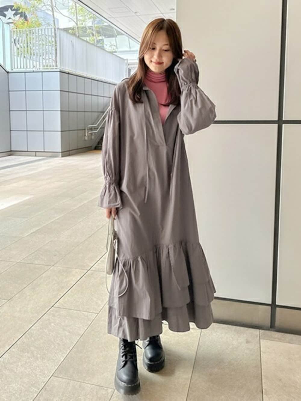 重ね着やアウターでずっしりとしがちな冬に着たい、軽くて華やかなワンピース。 裾の3段ティアードや袖口のシャーリングデザイン、セーラーカラーで存在感のある一枚。 インナーにタートルネックを合わせたり、上にカーディガンを羽織る着こなしがおすすめです◎