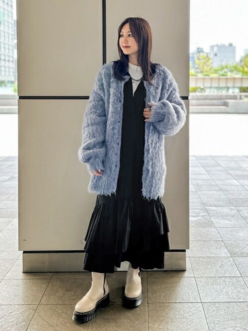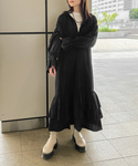 重ね着やアウターでずっしりとしがちな冬に着たい、軽くて華やかなワンピース。 裾の3段ティアードや袖口のシャーリングデザイン、セーラーカラーで存在感のある一枚。 インナーにタートルネックを合わせたり、上にカーディガンを羽織る着こなしがおすすめです◎