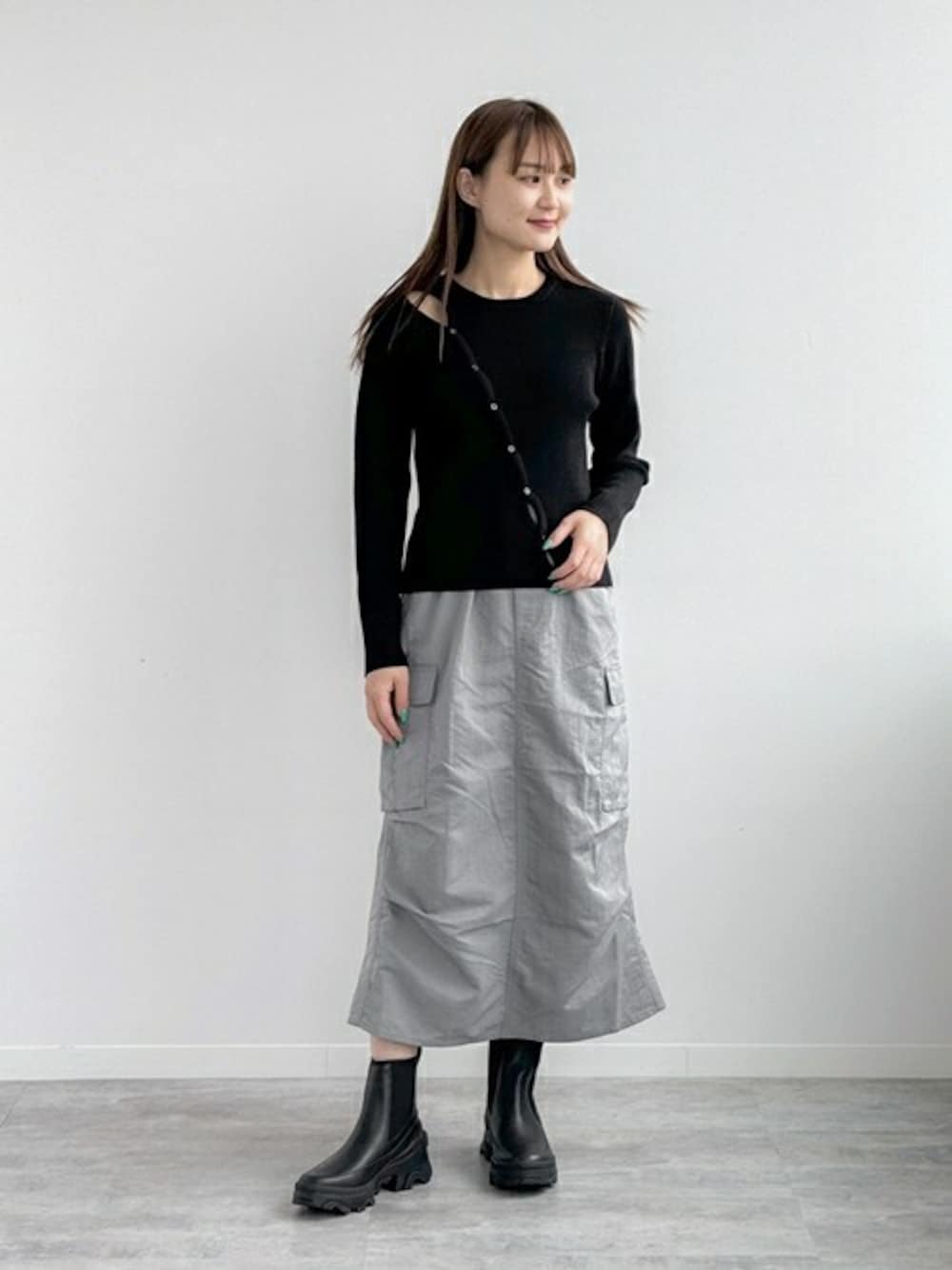 JOINT WORKSで人気のカーゴスカート。 この秋冬は、ミディ丈でブーツとバランス良く着こなすのが気分です♪