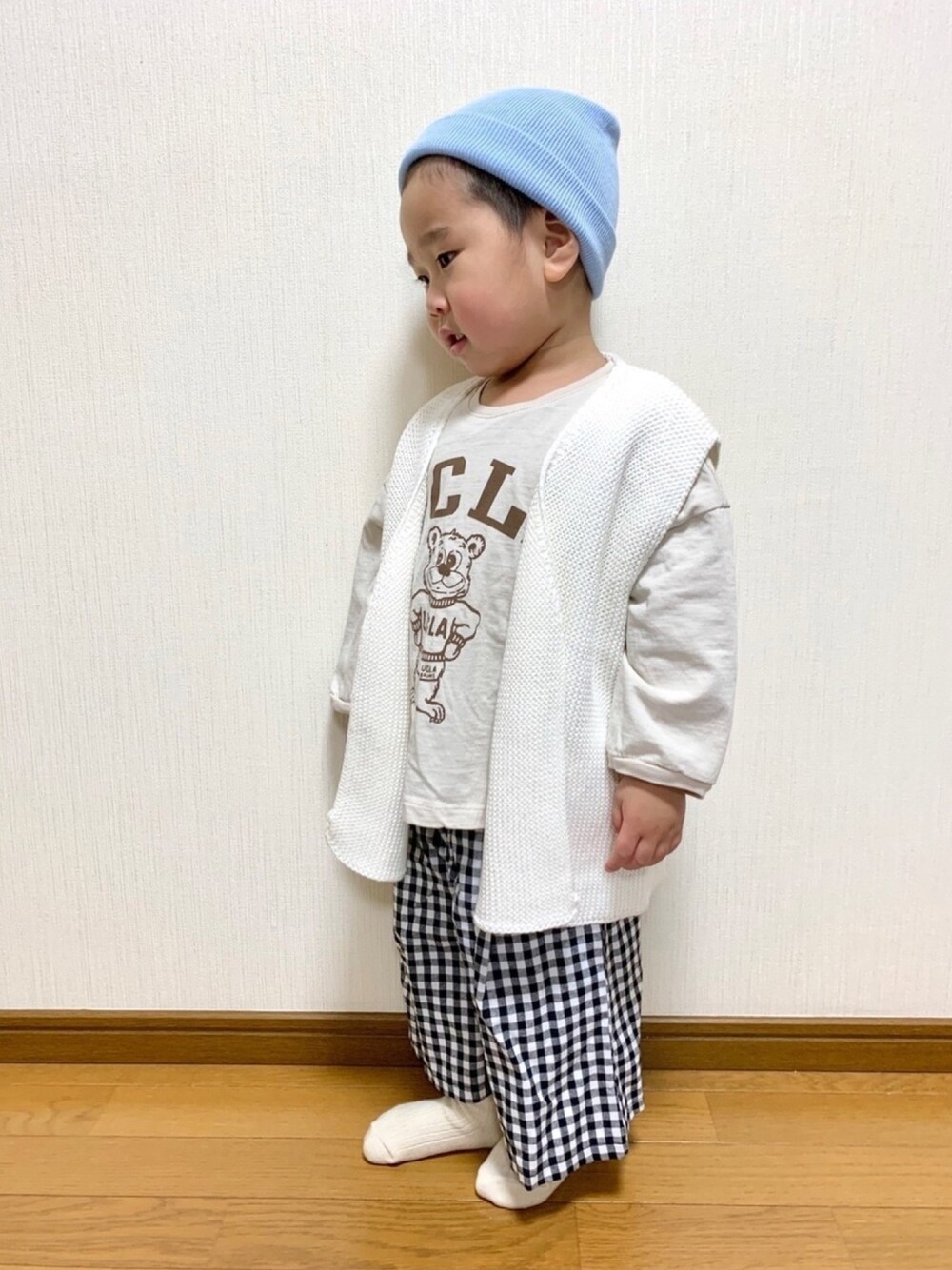 ブルー系のニットキャップ/ビーニーを着用したキッズの冬コーディネートの1枚目の写真