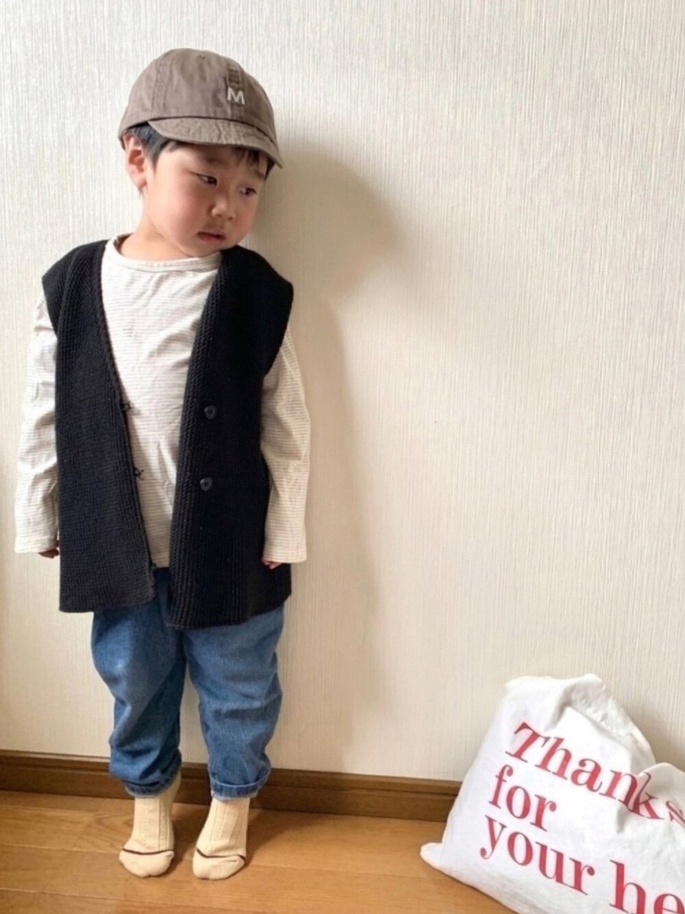 おはようございます^^* いいね、お気に入り ありがとうございます☆。.:*・゜ 週末、ずっとお家で 時間の過ごし方わからず、 息子に付き合ってもらって デイリーアイテムを1週間 着回しチャレンジ2日目。 Tシャツ+デニム plusニットベストでアクセント♪ つま先立ちして、身長誤魔化してることは 秘密(´艸`)