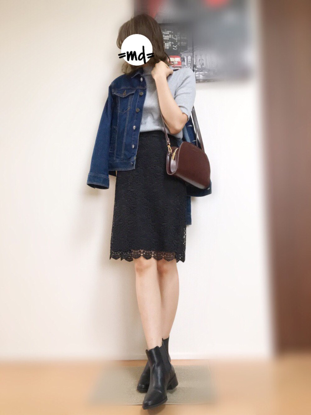 キレイめなレーススカートを デニムジャケットで少しカジュアルに! スニーカーにすればもっとカジュアル でも少しキレイめの割合多目にしたくて サイドゴアブーツにしました( ^^ ) ショートブーツをローファーとか オックスフォードシューズとか パンプスとかでも良さそうです◎