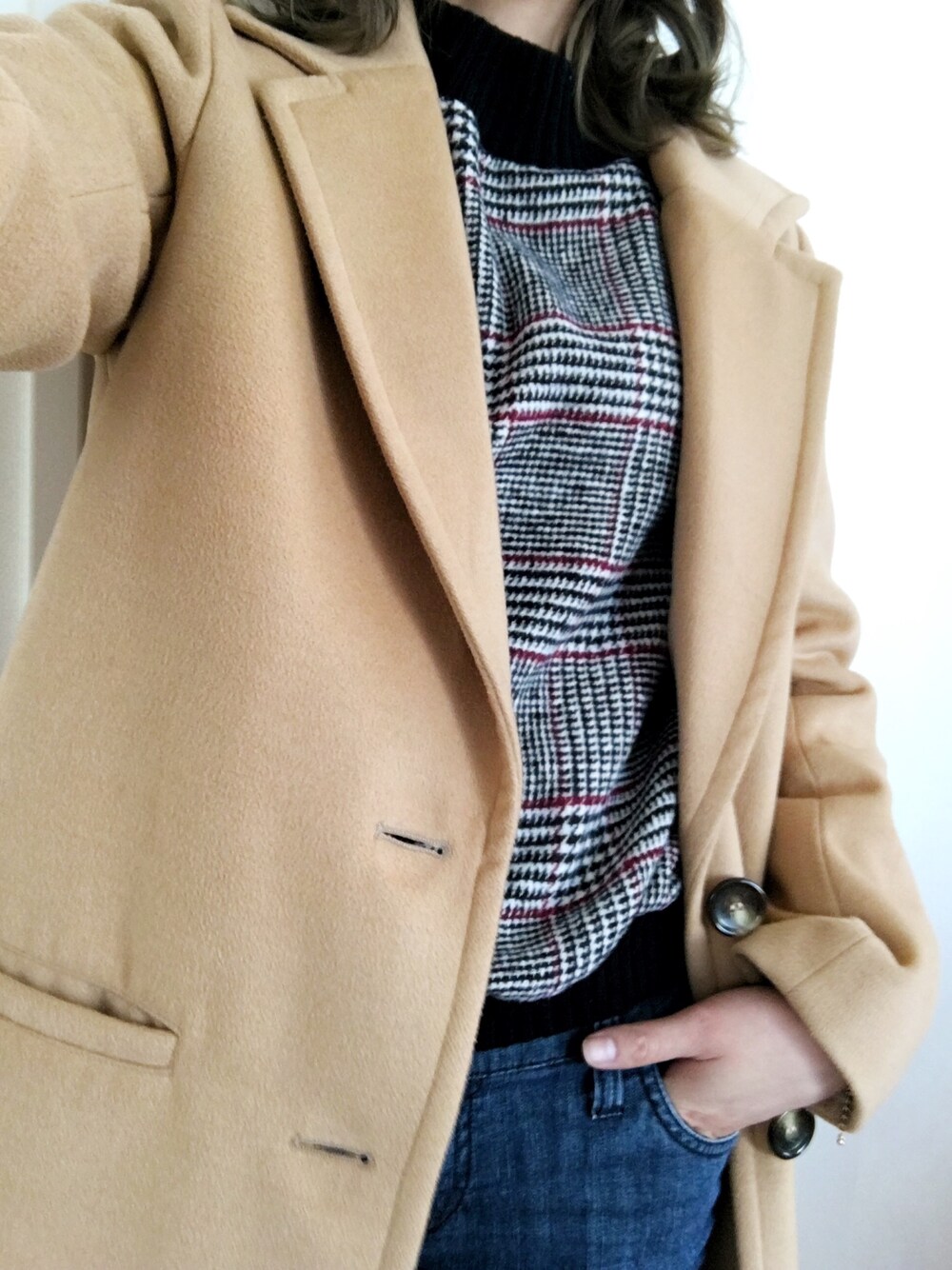 チェスターコートとグレンチェックでキレイめにして デニムとスニーカーでカジュアルに☆彡.。 載せてないけどバッグは小さめのキレイめタイプ! スニーカーをパンプスにすればキレイめの割合増えて 良い女風になれちゃうかも( 笑 )