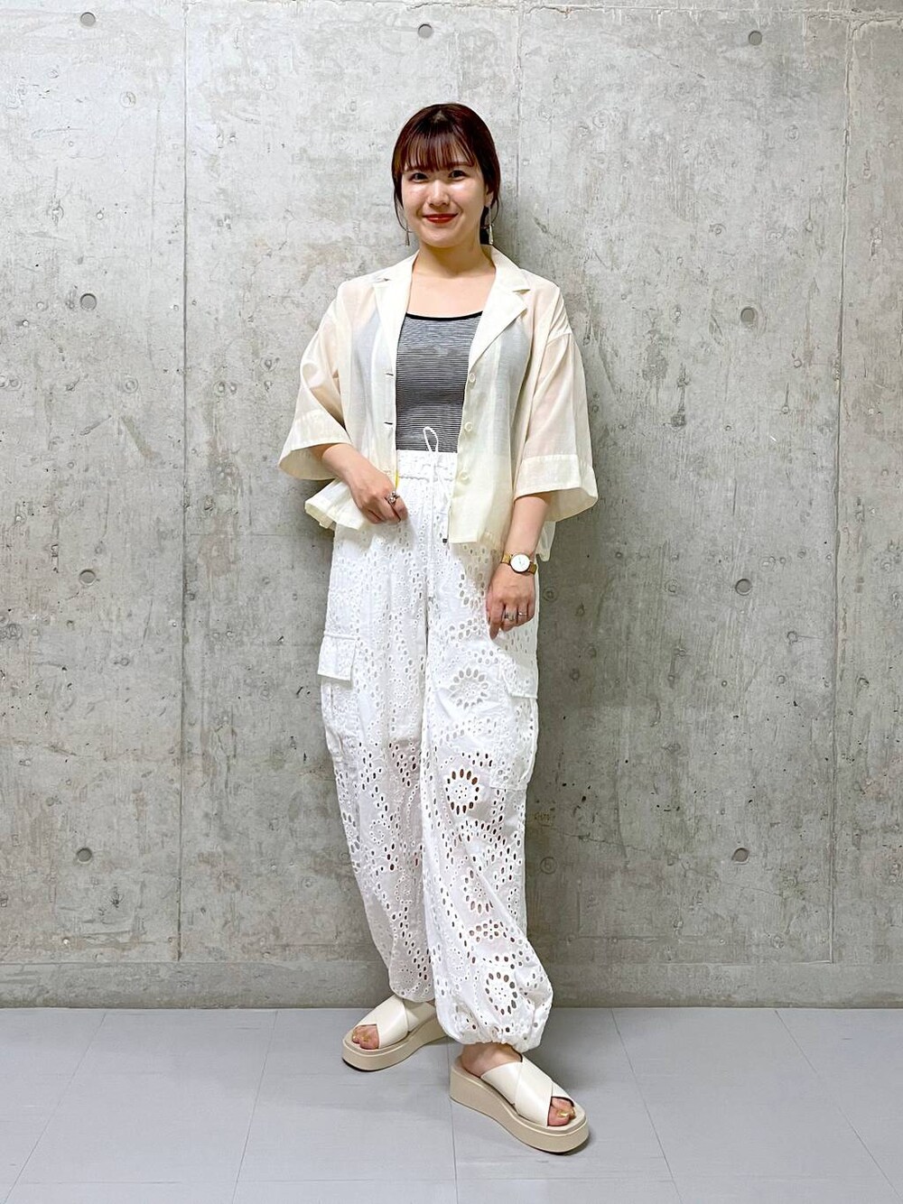 夏らしいシアーシャツ♡ スッキリ着られる丈感で、パンツやスカート、ワンピースの上など何とでも合わせやすいです!! 裾が絞れるのでお好みでシルエットも変えられます◎ カーゴパンツはお洒落なレース生地♡ 夏も涼しげで、がっつりカジュアルが苦手な方もレースなら程よく綺麗めさもあり挑戦しやすいです(^^) ゆるっと履けるのでとっても楽ちんです! 他にも動画やコーデたくさん載せています! 是非フォローしてご覧ください♡
