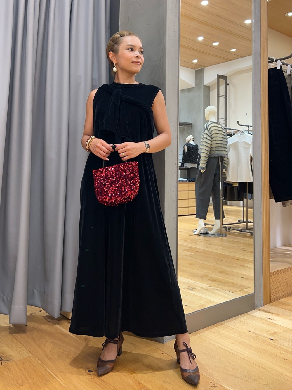 最近ヘビロテのベロアワンピ🖤 ベロアのさりげない光沢が上品で、漆黒の色味がツボです! 素材感は割と薄め🤏🏼 ワイド過ぎず、シルエットを綺麗に見せてくれます✨ 同じ素材のロングスリーブカットソーがあるので肩や腰に巻いても◎ 肌寒くなってきたらワンピの中に着ても可愛いですよ🤓 パールのアクセサリーなどと合わせてオケージョンドレスとしてもおすすめです🤭 パンプスはヒールが太めで歩きやすい! 走れます🏃🏻♀️ スパンコールがキラッキラのバッグはワンポイントに持ってこい💪🏻