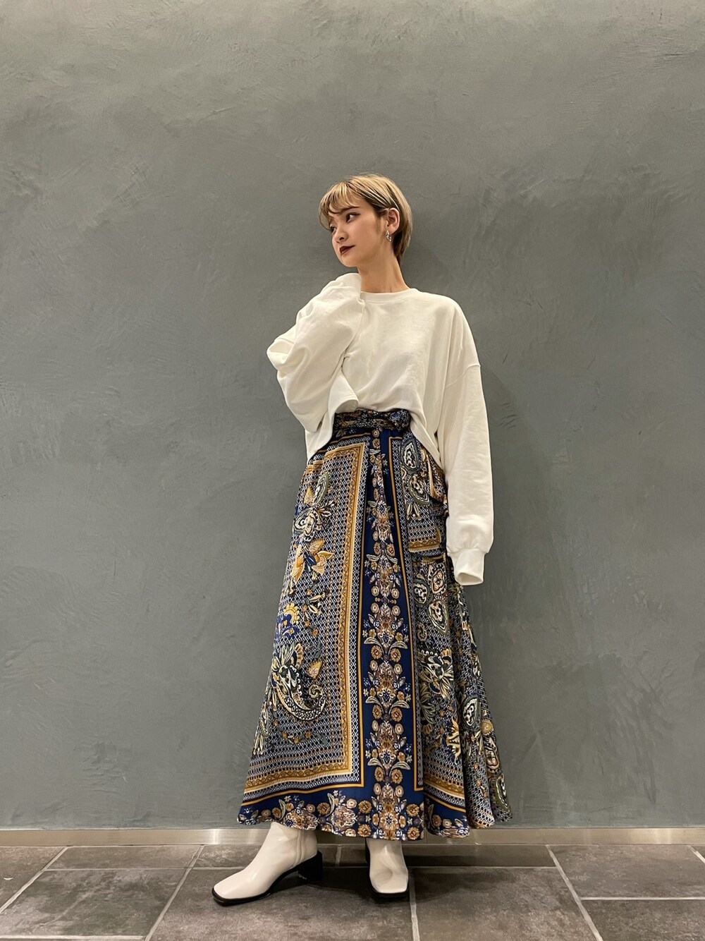 綺麗めなスタイリングを組みました。 スカートのデザインを生かせるようにトップスと足元はホワイトでシンプルにまとめました。