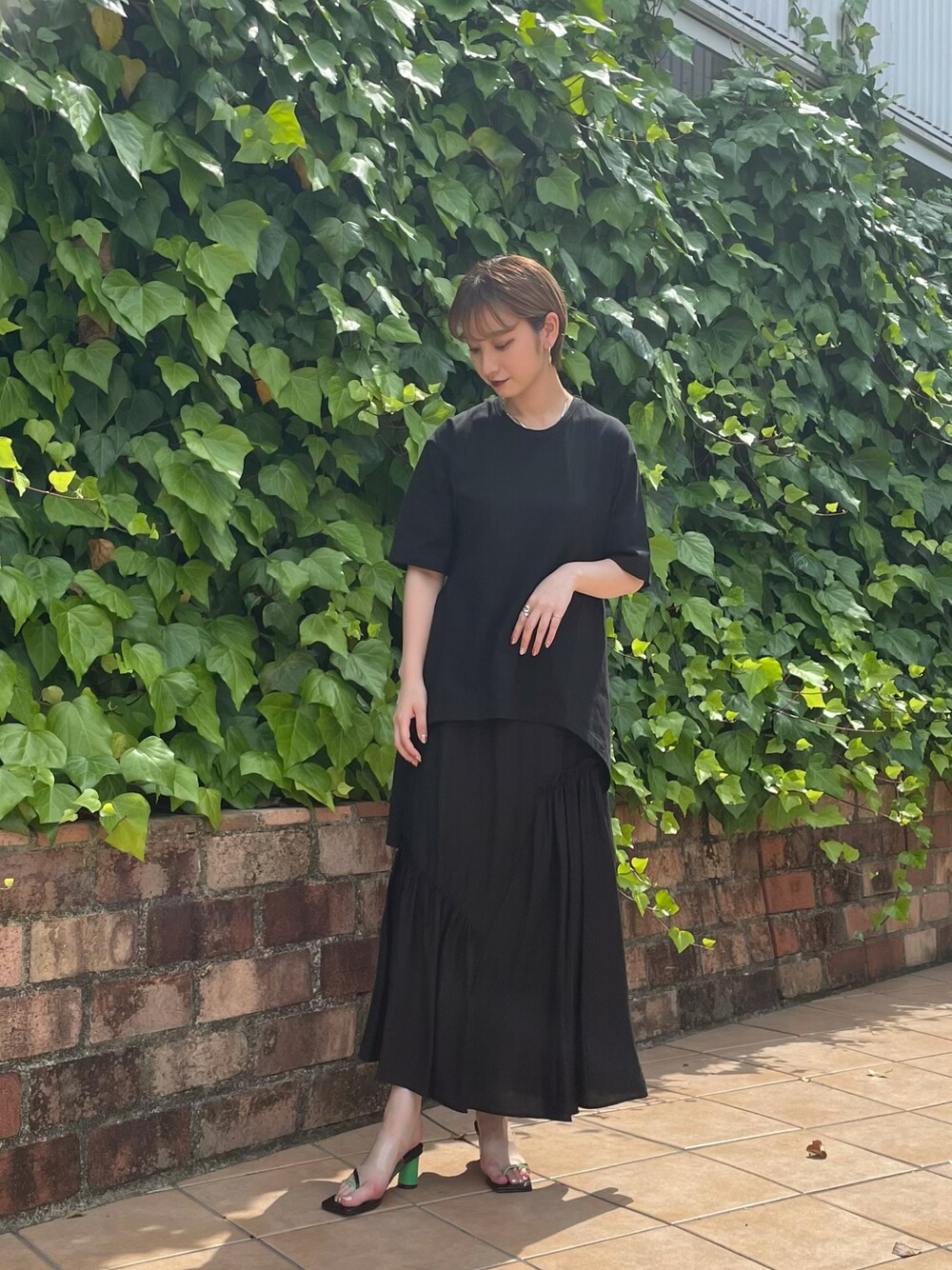 mkkkis(W------room)のスカート「ドロストアシメティアードスカート」を使ったコーディネート