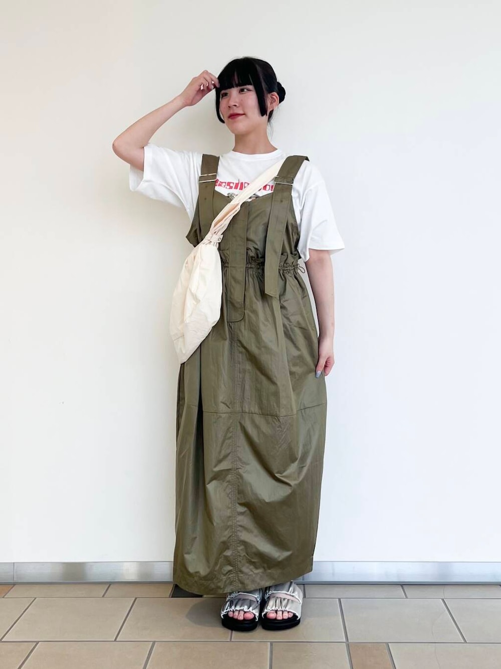 夏におすすめカジュアルコーデです𖤐 ̖́- インナーのTシャツはメンズアイテムですが Mサイズ着用でぴったりでした! デザインがすっごく可愛いのでおすすめTシャツです👍🏻⸒⸒🤍 ジャンスカは肩紐調整できます! ウエストは絞れるのでメリハリがついてすっきり見えしますꕀ☆ スリット入りなので歩きやすいです!