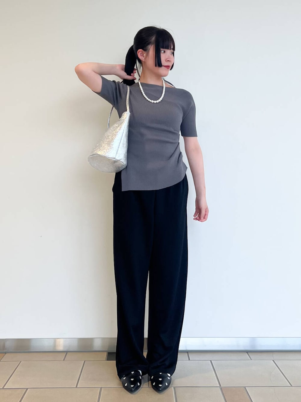 きれいめ大人コーデです🩶🖤 アシメントリーなデザインは、シンプルながらも抜群の存在感なので1枚でとても可愛いです! とても伸びやすい素材感なので着やすいです! パンツともスカートとも合わせやすい1枚です𖤐 パンツはすっきり足長見えするシルエットです! ウエストがゴムなので履きやすく、生地感も伸びやすいので普段にもお仕事用にもおすすめです!