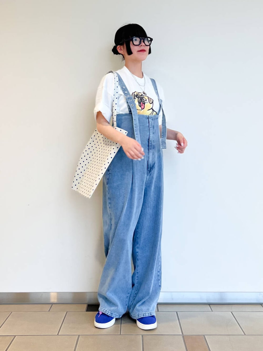 ワンちゃんのイラストが可愛いTシャツです🐶 メンズサイズのTシャツですが、袖をロールアップするとすっきりして見えます𖤐 ̖́- アクセントになるTシャツなのでおすすめです^^ サロペットは、ハイウエストでスタイルアップして見えます!!! インナー次第でオールシーズン使えるかな…と思います! Tシャツ×スニーカーでカジュアルに、 ブラウス×きれいめシューズできれいめコーデに変身できるので万能アイテムですꕀ☆ 通学にもプライベートにも使いやすいです!