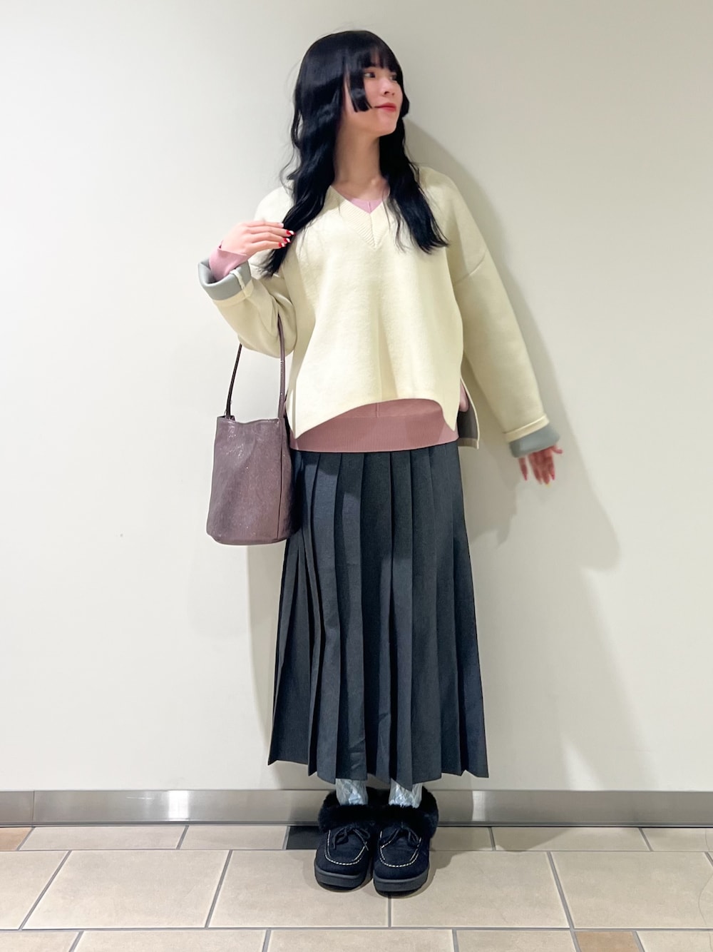 大人気のアウトリンキングVネックニットから新色が出ました!🎀 春らしいピンクカラーでとても可愛いです!! 薄手なのでインナーとしても◎です! Vネックニットはダブルフェイスなので袖を1折りするとワンポイントで可愛いです! プリーツスカートで可愛さプラスです^ ^