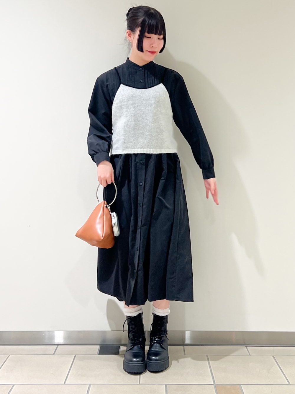 ブラック×ホワイトのシンプルコーデです☆゛ 1枚でもしっかり可愛いワンピースですが、 ニットキャミと合わせて可愛さプラスです◎