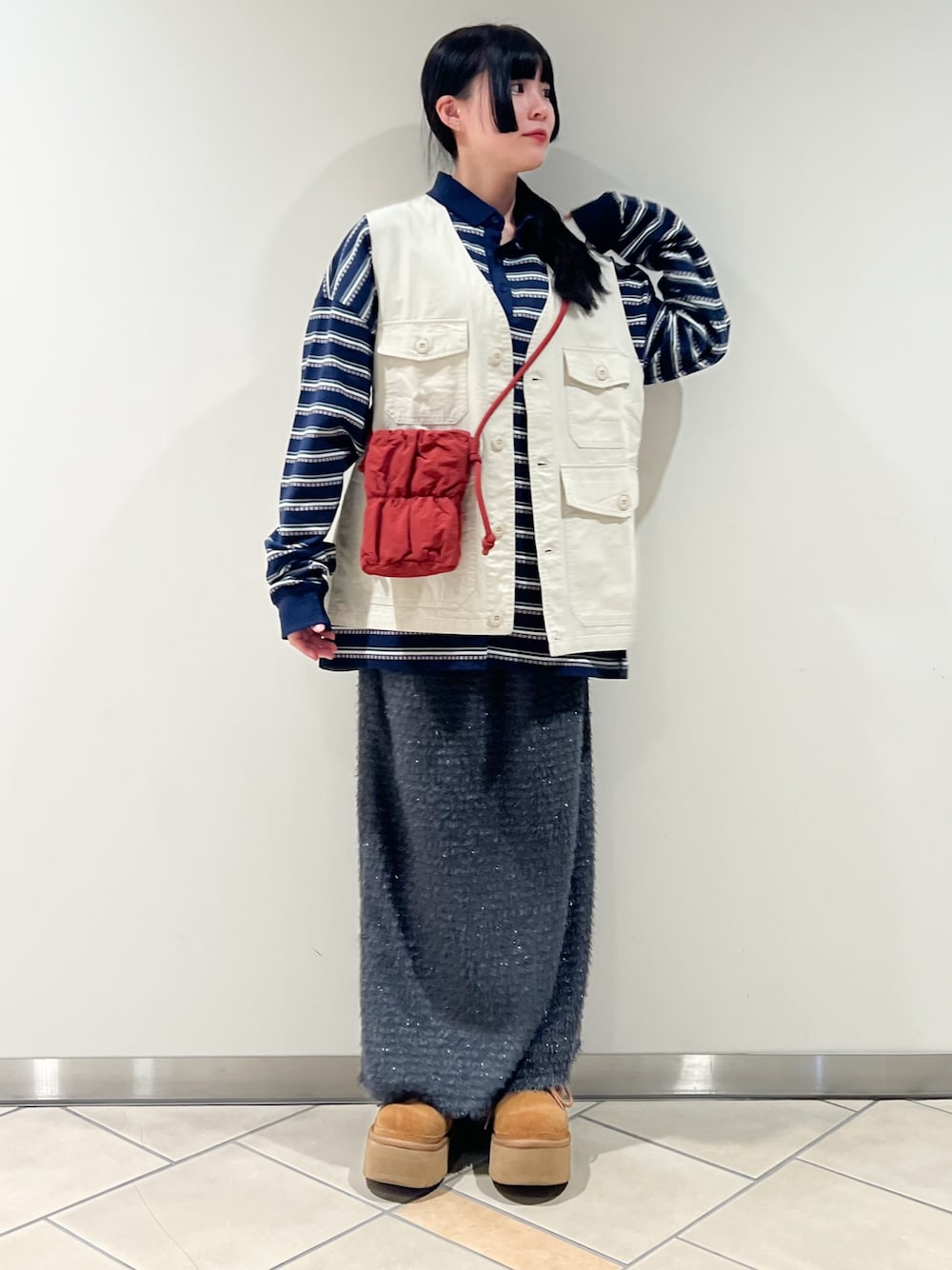 ゆるだぼっとコーデです◎ トップスはロンTもベストもメンズサイズでゆったり着てます! スカートはラメ素材の物を合わせて可愛らしさも入れてみました!♡‴