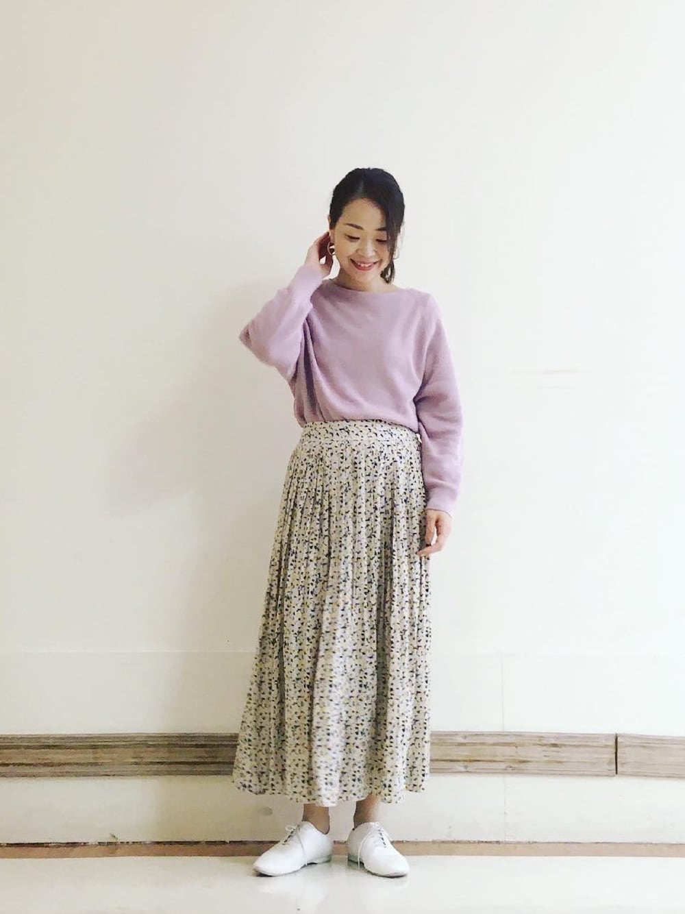 春らしいフェミニンコーデ。くすんだピンクカラーが甘過ぎず大人っぽい印象に。 落ち感の綺麗な柄物のプリーツスカートはワンピースの下に重ねても可愛い☺︎