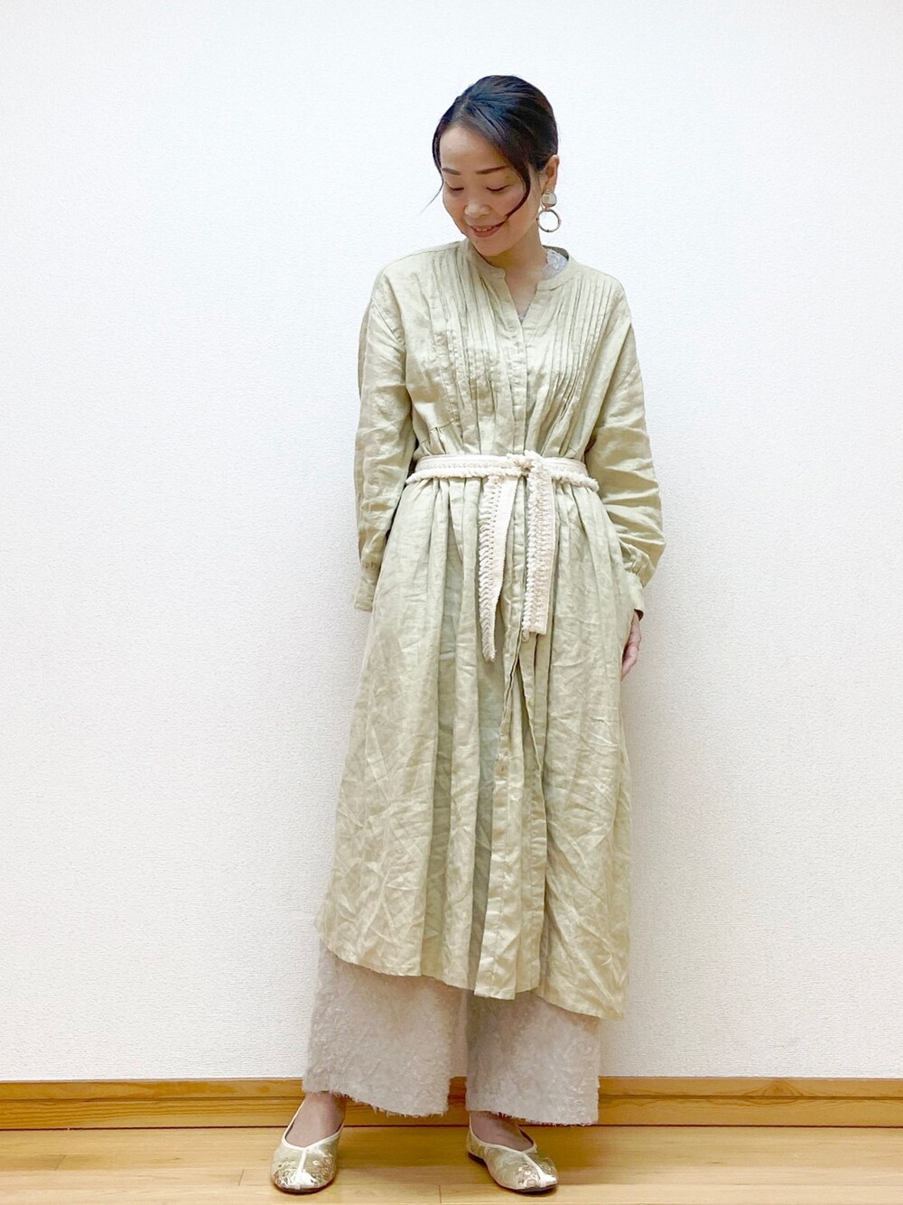 mkmoririnのワンピース「リネンピンタックオーバーワンピース」を使ったコーディネート