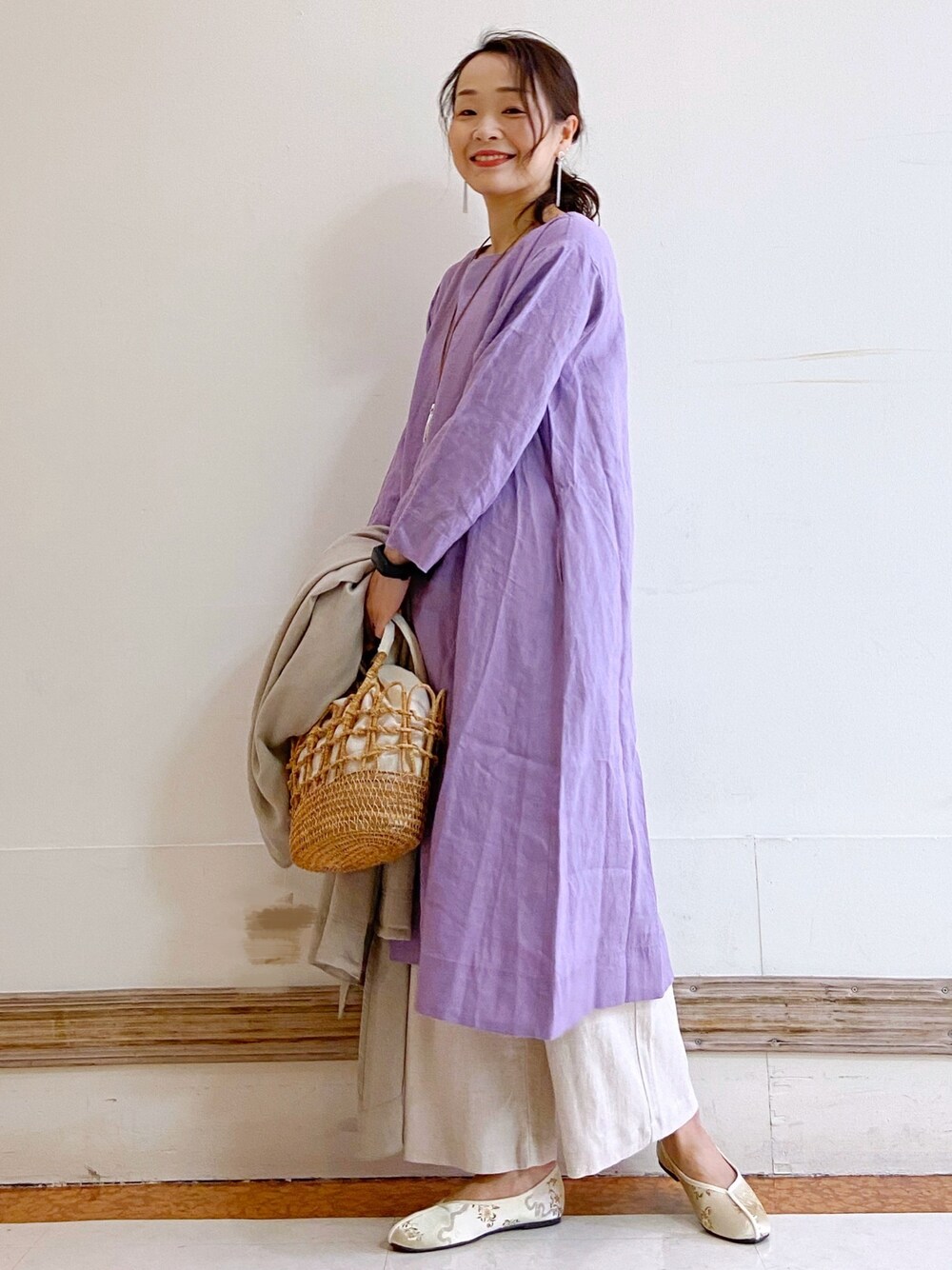 毎年定番のフレンチリネンのワンピースはラベンダーカラーが今年らしいカラー。 スカートやパンツとのレイヤードがおすすめ!