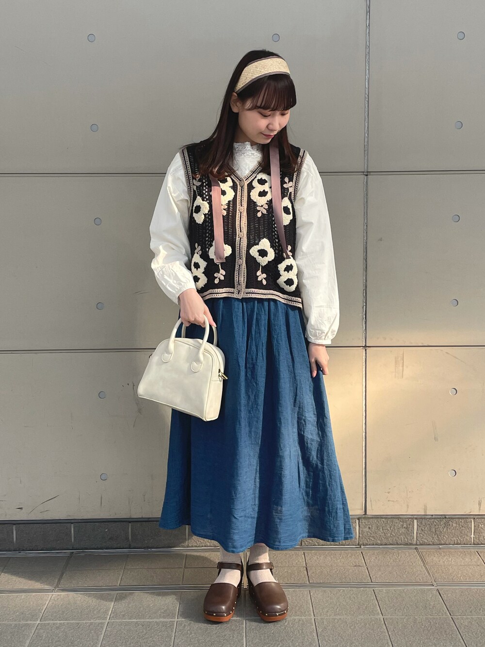 ご覧いただきありがとうございます🌼 ぽこぽことしたお花の刺繍が可愛いベストを使った春コーデ🌸 ゆったりとしたデザインなのでいろんな組み合わせが考えられそうです♪