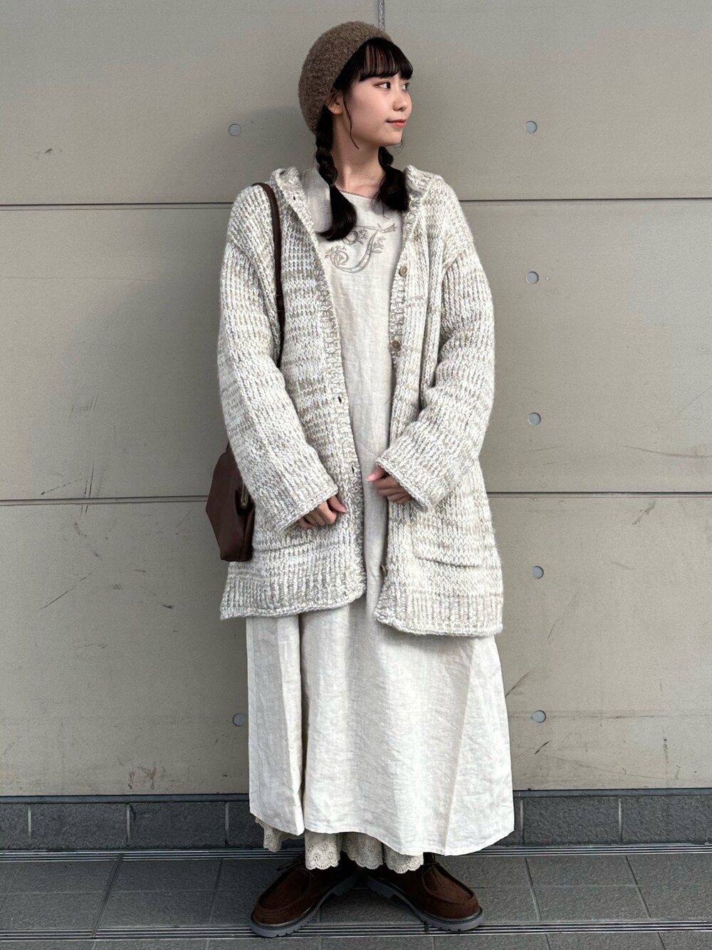 やまもとのカーディガン/ボレロ「ミドル丈フードニットカーディガン」を使ったコーディネート