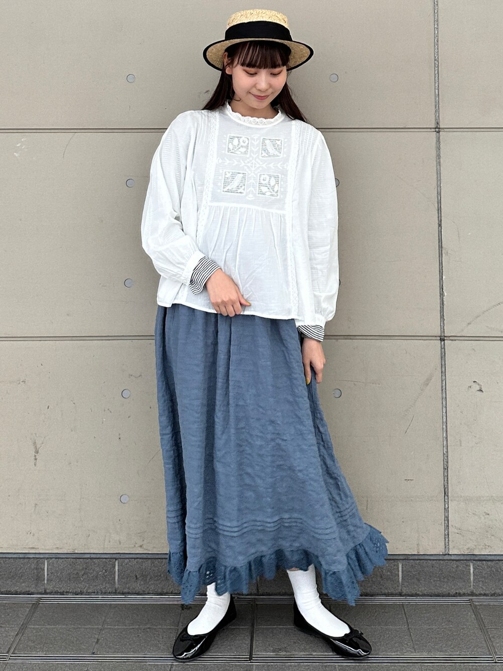 やまもとのハット「ラフィア太リボンカンカン帽」を使ったコーディネート
