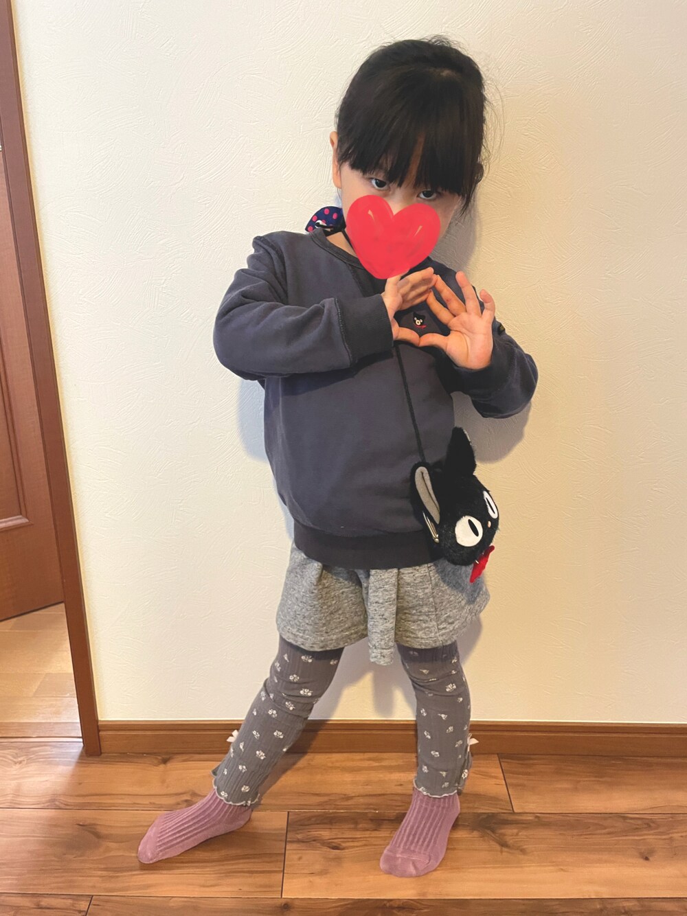 今日も甥っ子お下がりコーデ イオンで買った激安スカートにレギンスを合わせて、女子らしく。 ジジのポシェットもお気に入り🐈⬛ 5y2m▶︎108cm、19kg