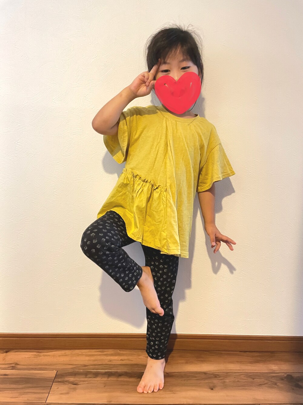 アシンメトリーに一目惚れ♡ 黄色のトップス持ってなかったから購入! 袖がフワッとしてて、とても可愛い💕 5y7m▶︎110cm、20kg