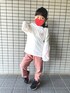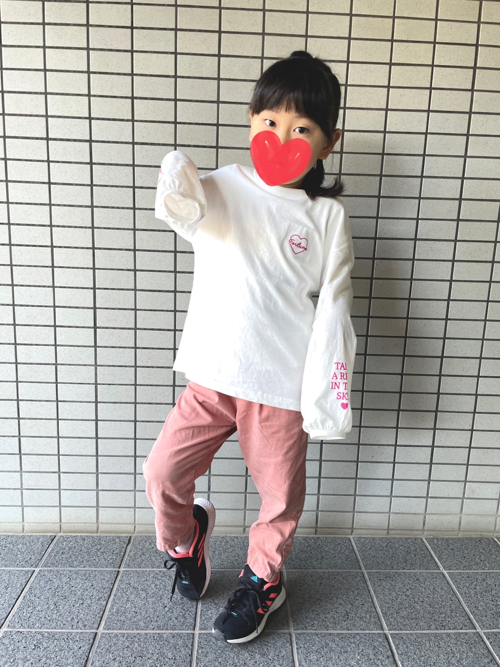 上着なしでお出掛けできる、ちょうどいい季節✨ 新しいグローバルワークのトップスは、袖のサイドに文字が入ってて大人っぽい♡ 5y11m▶︎110cm、20kg