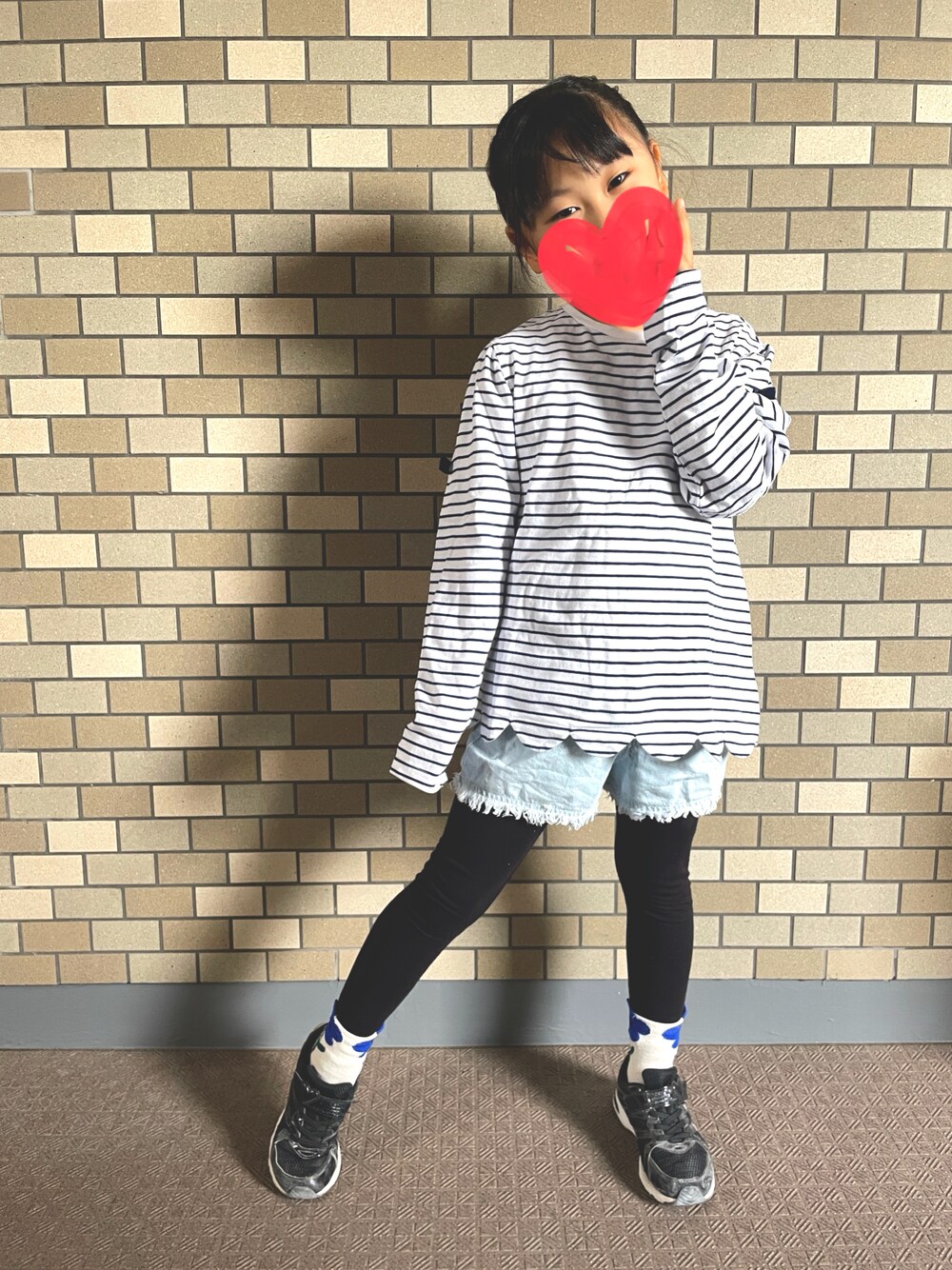 久しぶりの投稿🙌 今日は長袖1枚で丁度いい気候! デニムは夏にヘビロテして大好きなズボンを、下にレギンス履いて、まだまだ着る予定(笑) 7y▶︎123cm、24kg