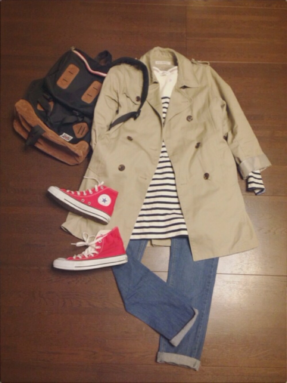 ボーダーチュニック。 スニーカー:コンバース ボーダーチュニック、 トレンチコート、 スキニーデニム:B.L.U.E. とってもシンプル〜 大好きなトリコロールカラーで☻