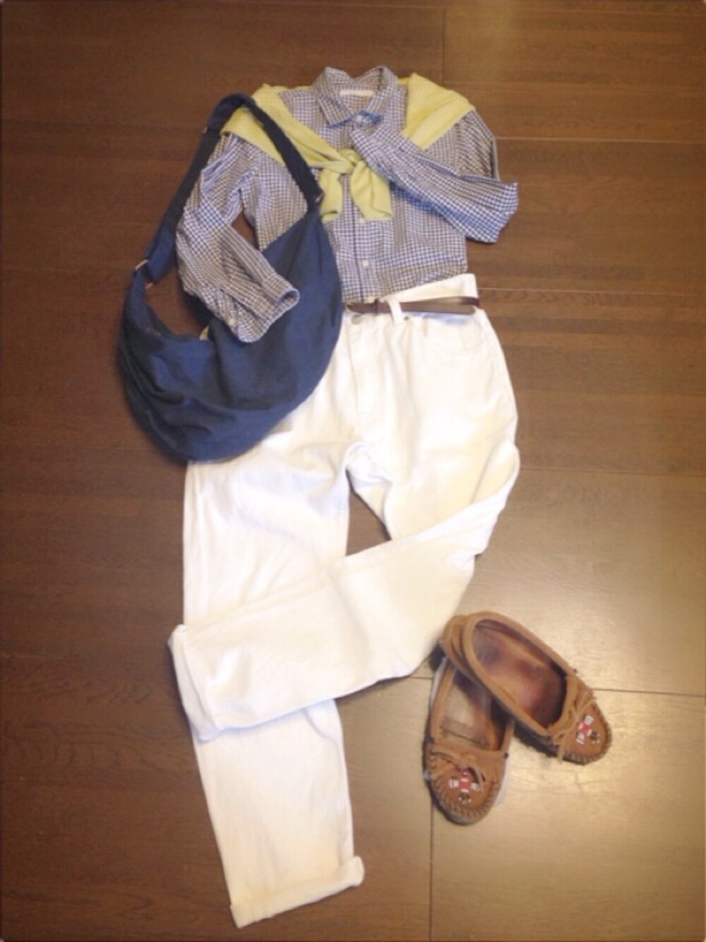 ちょっと前のコーデ☻ ギンガムチェックシャツ:LOWRYSFARM カーディガン:B.L.U.E. ホワイトデニム:B.L.U.E. キャンバスショルダー:B.L.U.E. プレッピーといえばシャツ。 これに丸めがねかけていい子ちゃんスタイル。