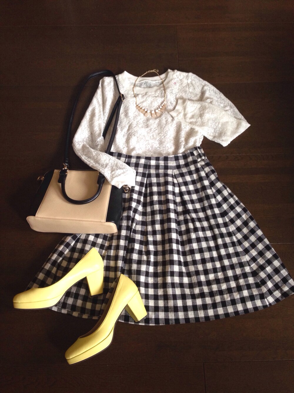 めずらしくフェミニン。 レーストップス:RETROGIRL スカート:Techichi パンプス:w closet 差し色で春らしいイエローのパンプス! お気に入りのギンガムチェックのスカートで女の子らしく❁
