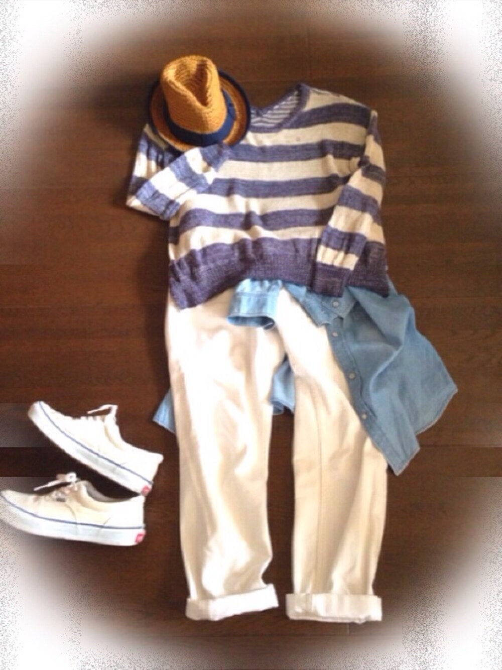 ニット:B.L.U.E. ホワイトデニム:B.L.U.E. デニムシャツ:ciaopanic ストローハット:B.L.U.E. 久しぶりの更新〜 マリンぽさを意識してコーデ☻